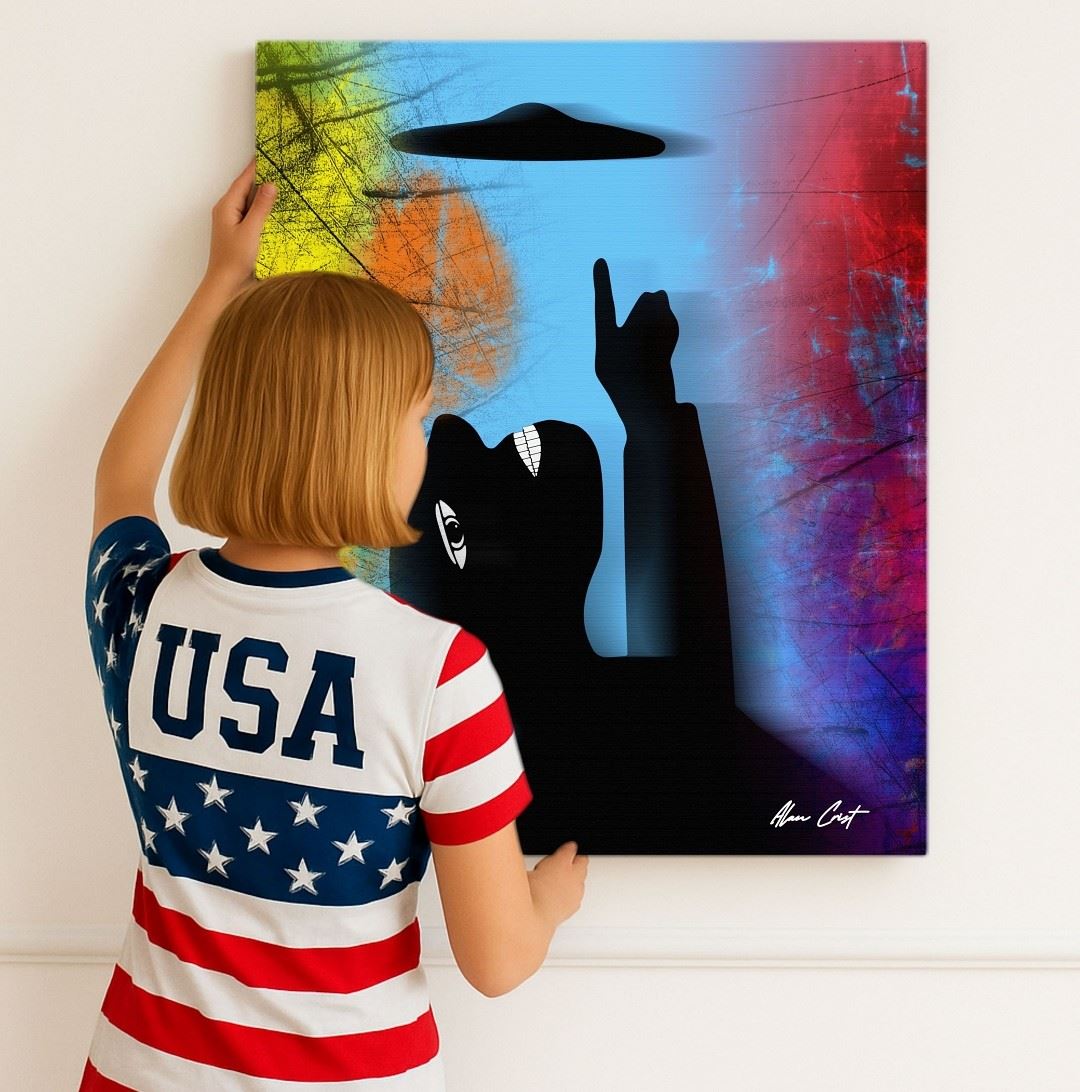 Abstract Art S500-2405 Personal License-a mysterious UFO hovers above as a silhouetted figure reacts in awe and disbelief. Vivid colors merge dream and reality, capturing humanity’s timeless fascination with the unexplained. Artwork by Alan Crist.